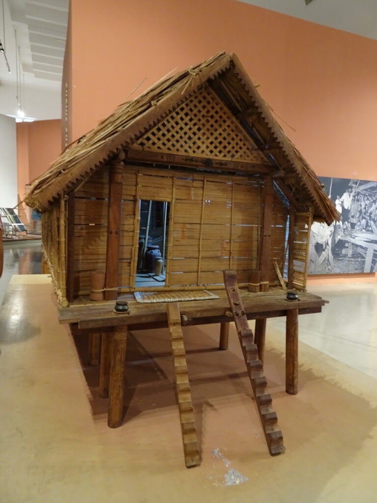 Voici une maquette de la maison traditionnelle de la région, appelée longhouse. Elle est construite toute en longueur sur pilotis traditionnellement contre les inondations. Même en zone inondable, comme ici dans les hauts plateaux, les pilotis ont été gardés. Cela permet de protéger des bêtes sauvages et peut abriter en dessous le bétail ou faire office de garage pour le tracteur.