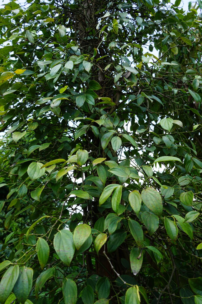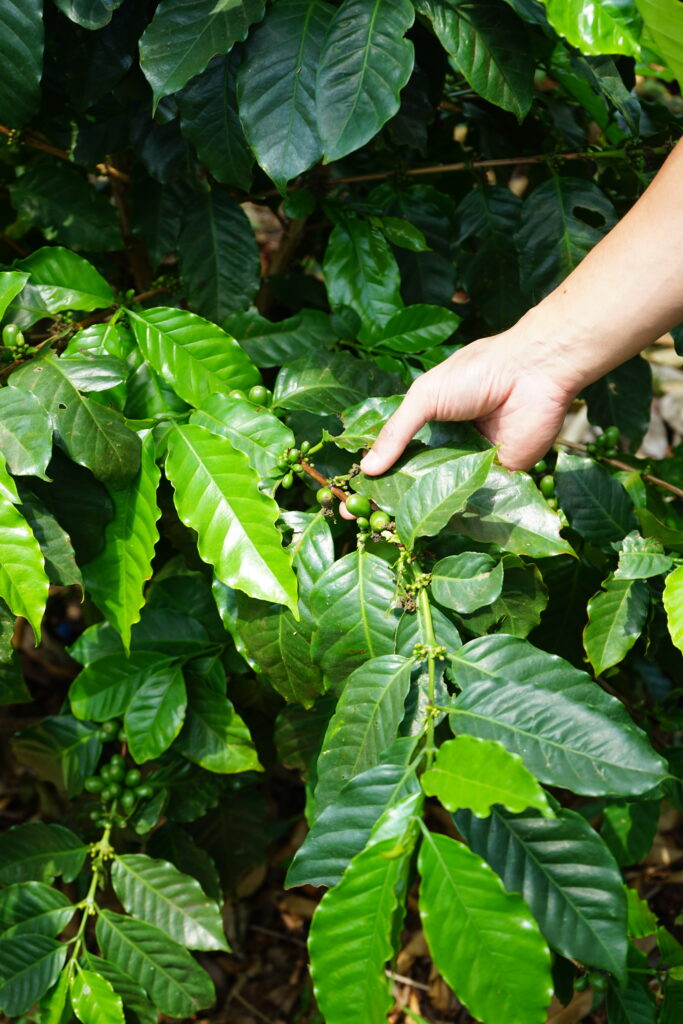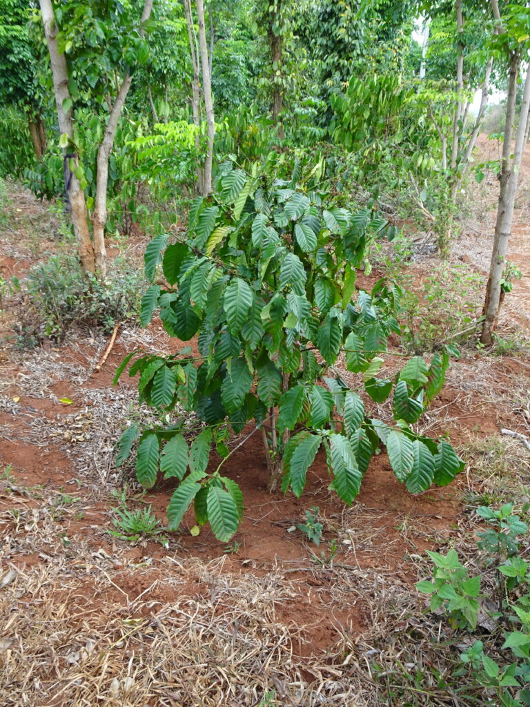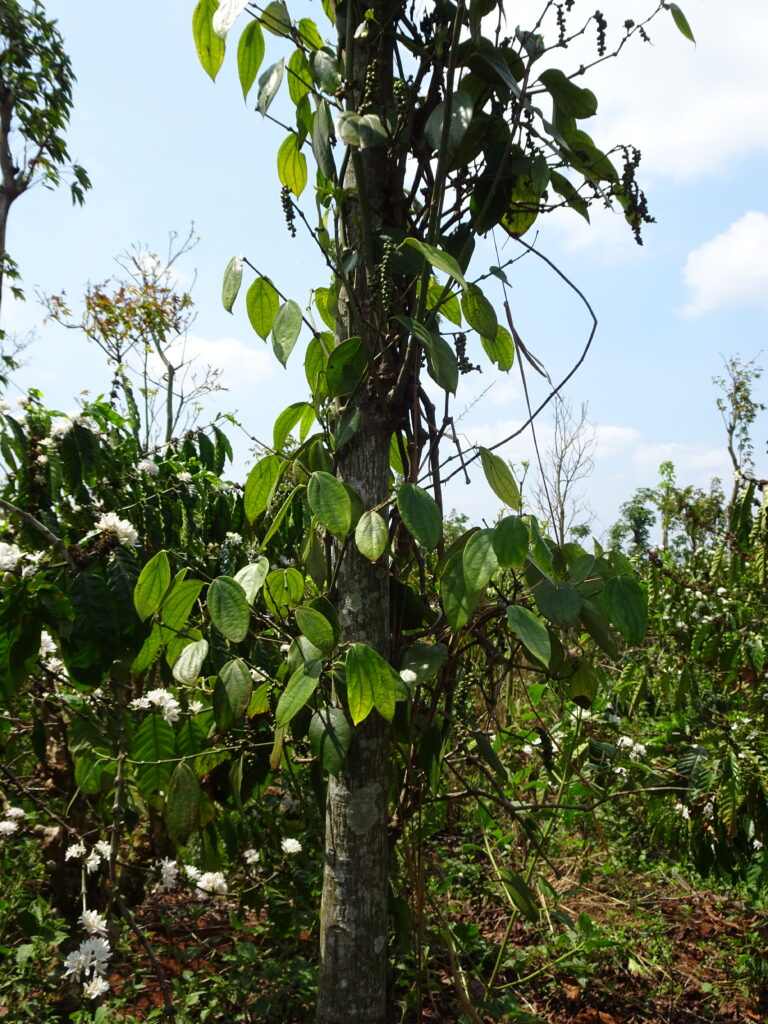 La ferme que nous visitons vise une production de café de qualité contrairement à d’autres fermes qui mise sur le volume. Cette ferme privilégie donc une plantation mixant différentes variétés d’arbres. Ceci permet de faire de l’ombre aux plants de caféier le temps de leur croissance et aussi de limiter l’usage de produits chimiques car la biodiversité est plus grande. Quand les plants de café ont grandi, les arbres qui les ombrageaient sont coupés et deviennent des supports pour la culture du poivre. Les plants de café sont aussi taillés pour rester à 1 mètre 60 de haut et faciliter la récolte. Leur hauteur à l’état sauvage est de 10 mètres.