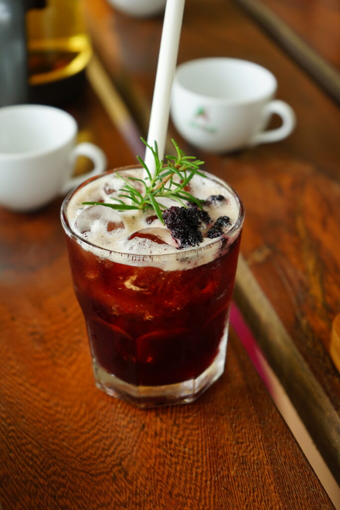 - coldbrew avec sirop de mulberry (mûre du murier à soie) : une infusion à froid de café.