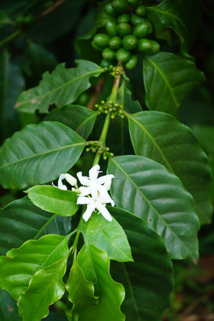Les plants de robusta ont des feuilles plus grandes, des grains plus petits mais plus de caféine. Les plants de Robusta sentent le jasmin et ont besoin des abeilles pour leur pollinisation. A contrario l’arabica qui est auto fertile n’a pas d’odeur.