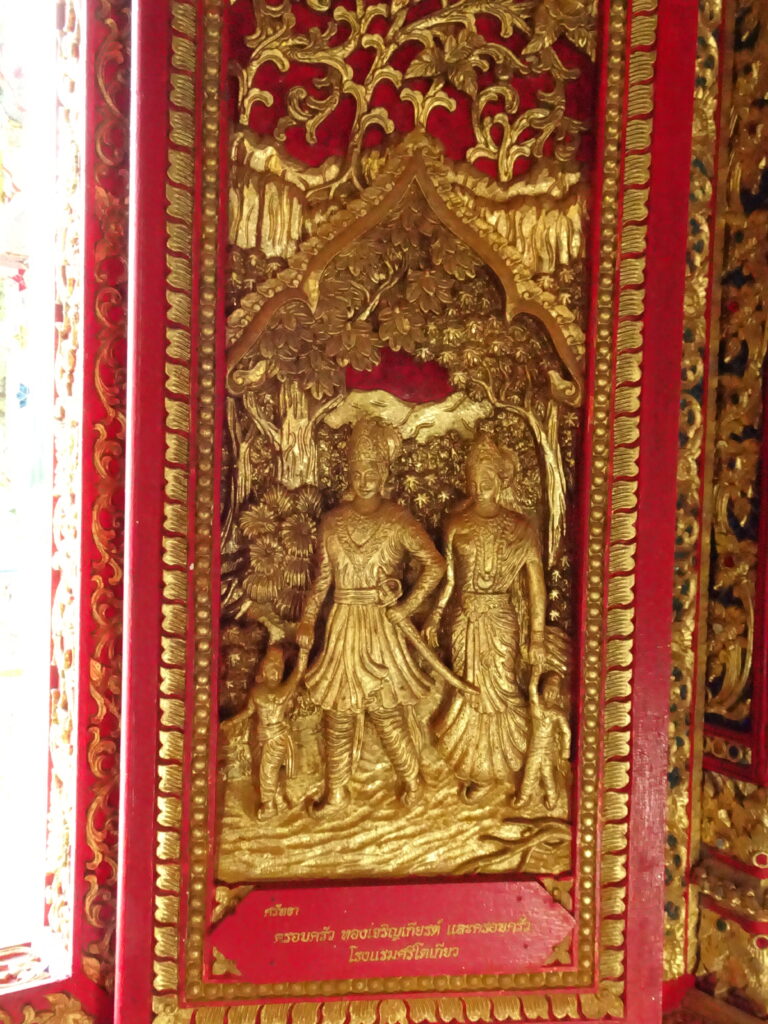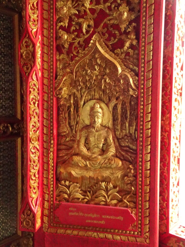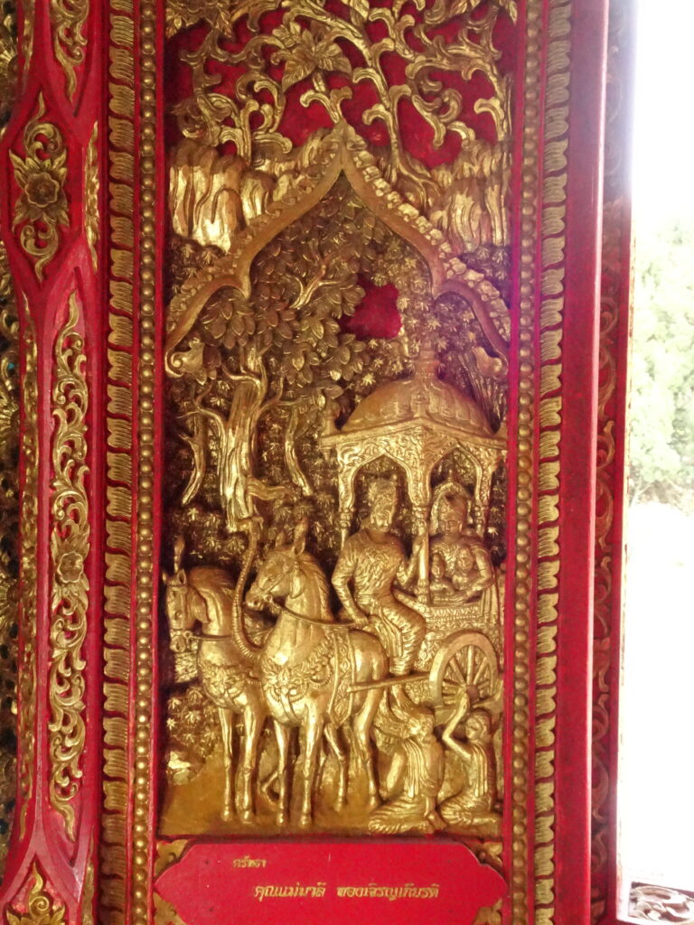 Des volets en bois rouge et dorure reprennent des scènes de la vie de bouddha.