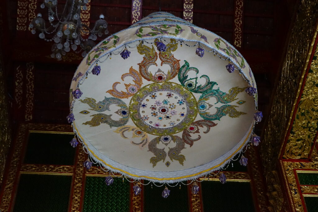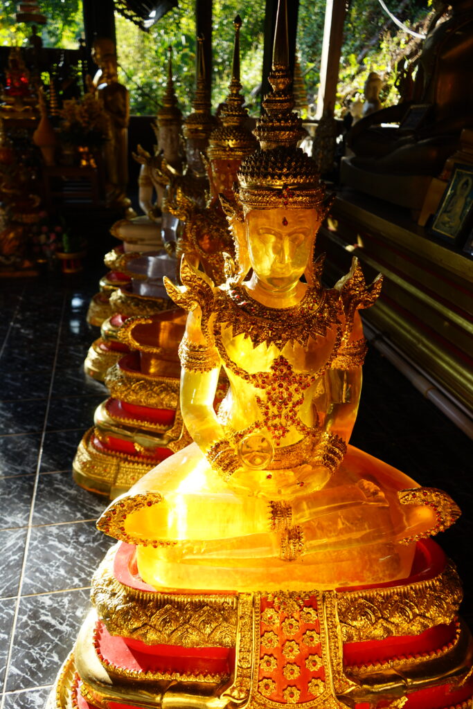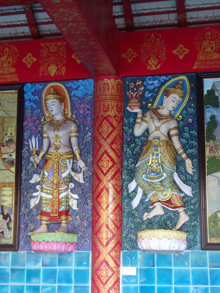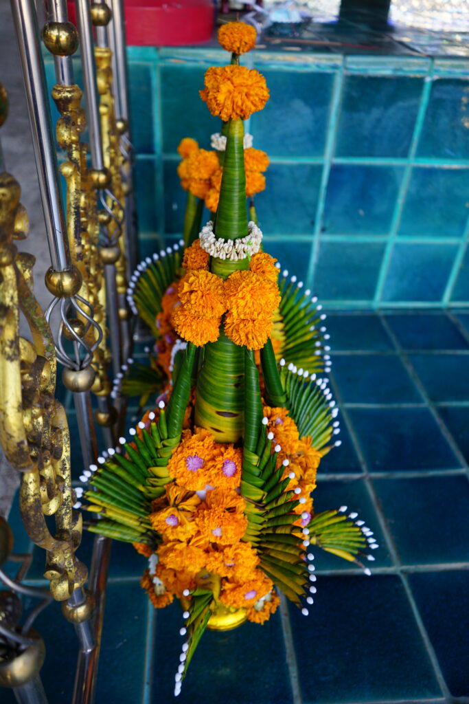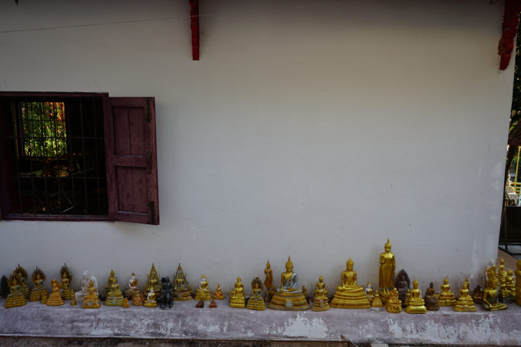 Nous sommes ensuite arrivée à l’Ubosot. C’est le lieu où se déroulent certains rites religieux dont l’ordination des moines. On peut reconnaitre un ubosot car il est entouré de stèles appelées Sema. Celles-ci marquent l’emplacement de huit sphères enfouies dans le sol autour de l’ubosot. Ces sphères ont été pendant un moment exposées pour que les fidèles les recouvrent de petites feuilles d’or avant d’être consacrées et enfouies. Le lieu devient ainsi sacré et protégé des mauvaises forces.