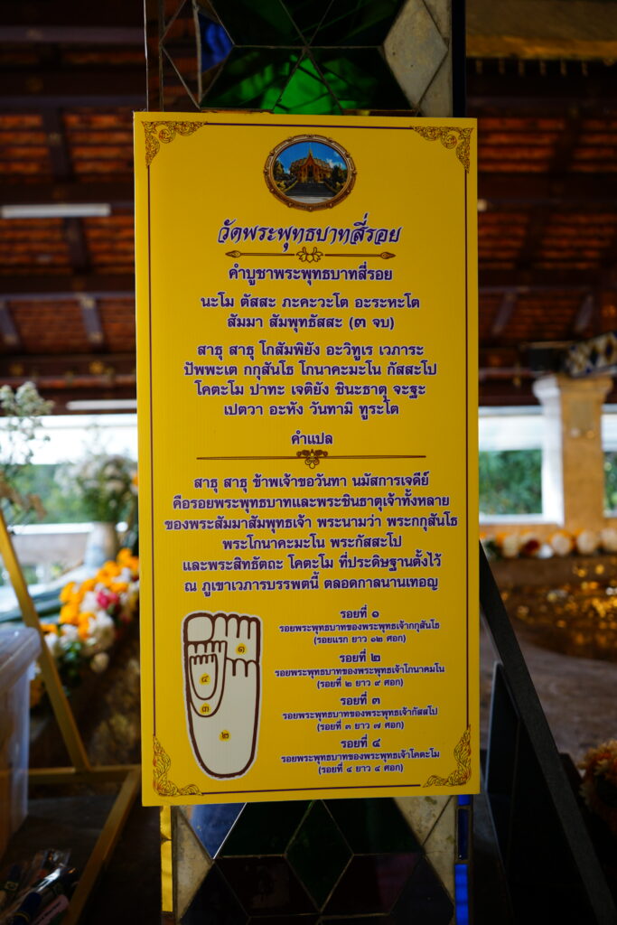 L’empreinte de Bouddha est en fait constituée de quatre empreintes de tailles différentes s’emboîtant les unes dans les autres. Elle est abritée dans un viharn (salle pour rassembler les fidèles pour prier) protégé par des nagas (serpents). Les quatre empreintes ne sont pas celle du même bouddha mais de quatre d’entre eux (Kassapa, Konāgamana, Kakusandha et le Bouddha Shakyamuni).