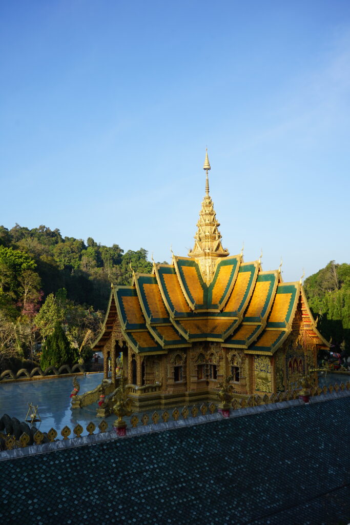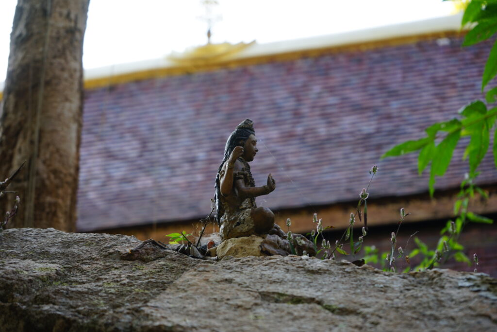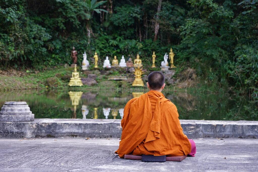 Le Wat est construit sur un grand espace. Des chemins plus ou moins escarpés permettent une promenade très agréable. En les empruntant, nous sommes arrivés près d’un lac paisible où un moine méditait.