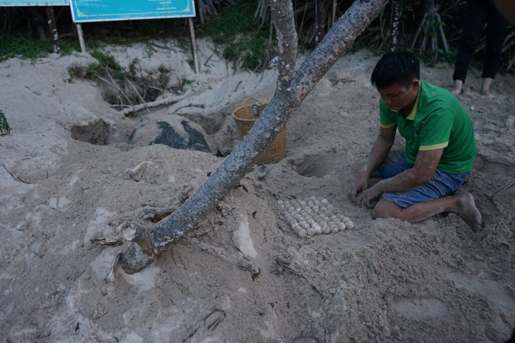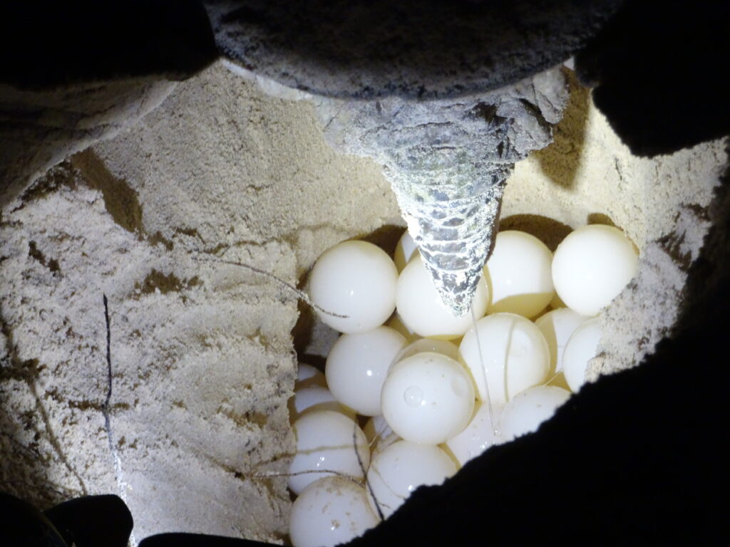 Quand la tortue à terminer de pondre, elle commence à recouvrir ses œufs de sable pour les enterrer. C’est à ce moment là qu’un garde du parc vient les récupérer, les comptes et les emmène ensuite dans la zone d’incubation. Les œufs incubent pendant 50 à 60 jours. Suivant la température du sable, il y aura des tortues femelles (sable au dessus de 30 degrés) ou des tortues males (sable en dessous de 28 degrés).