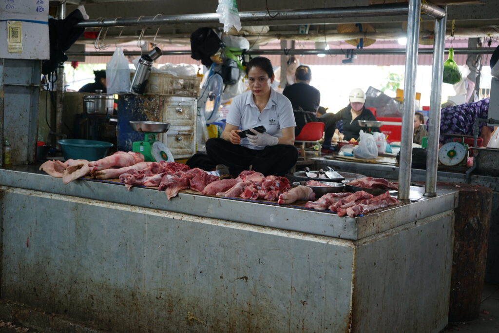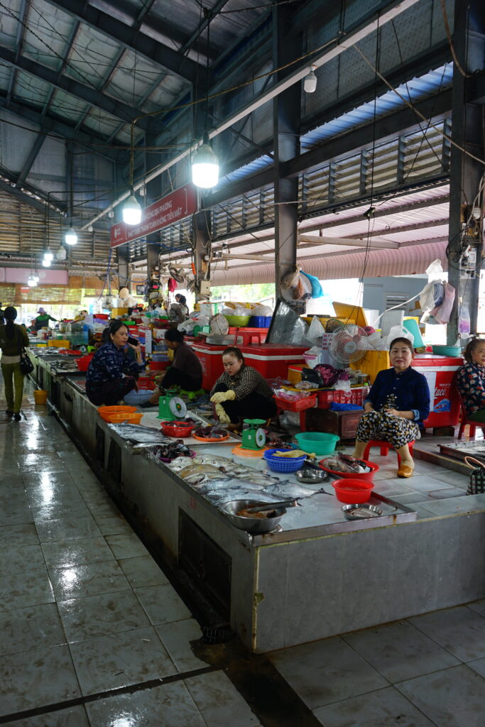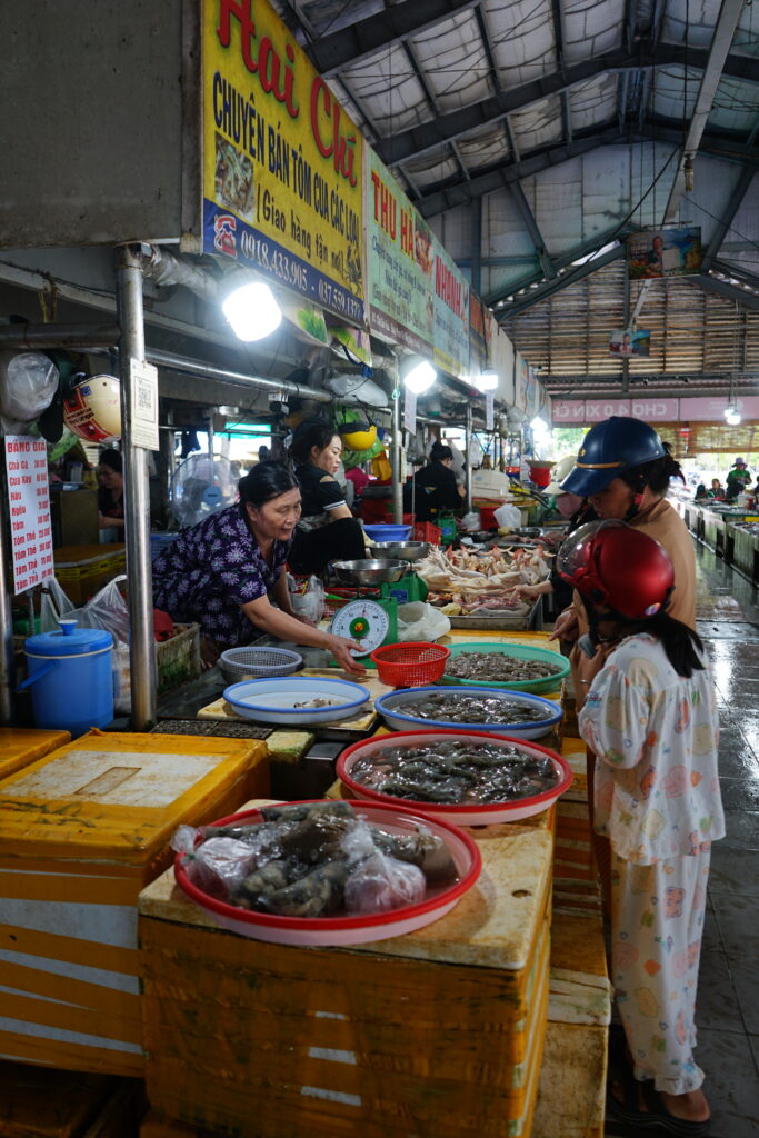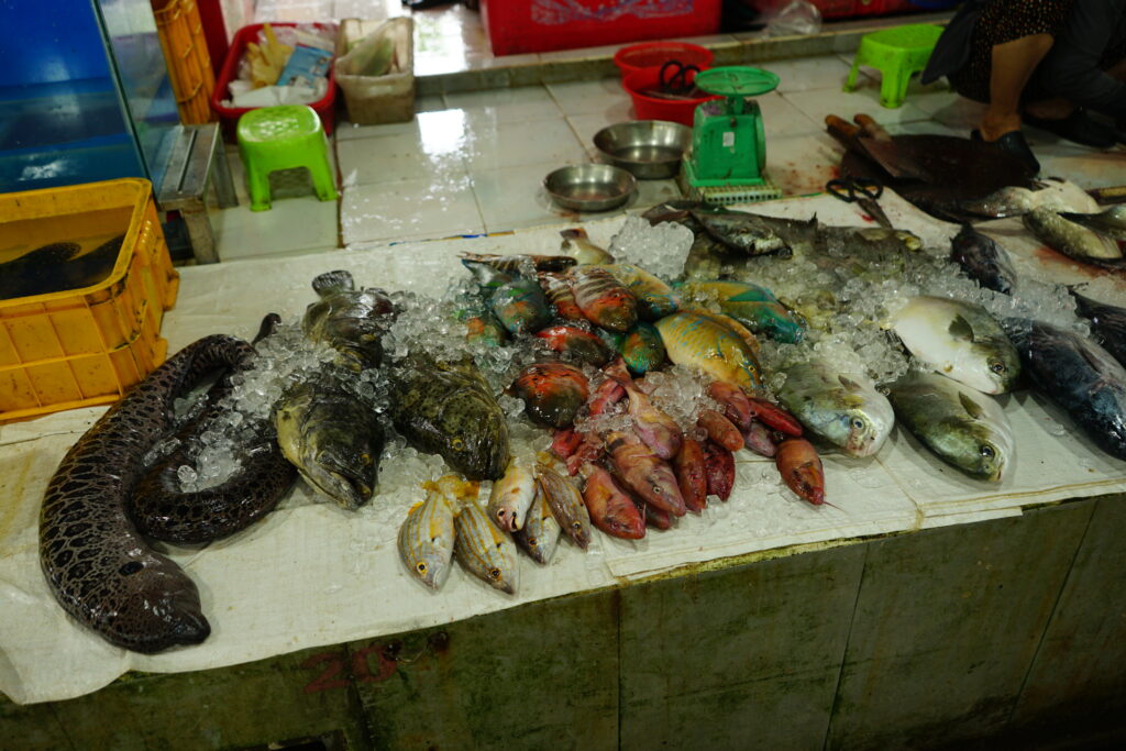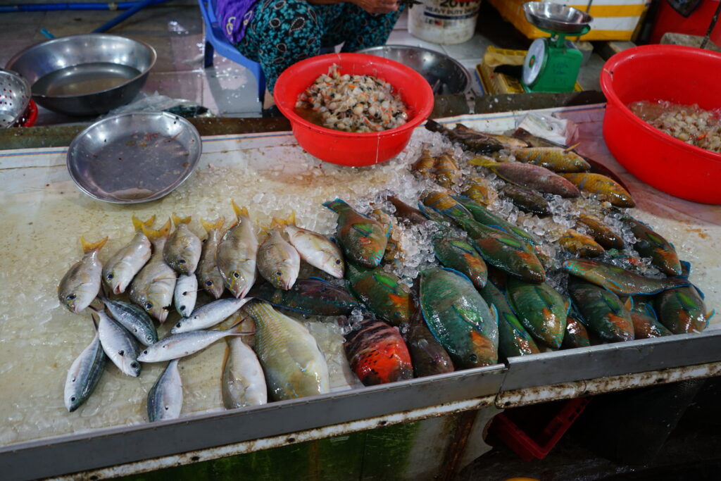 Les vendeurs sont assis à la même hauteur que leur marchandise. L’étal de poissons et des fruits de mer est coloré.