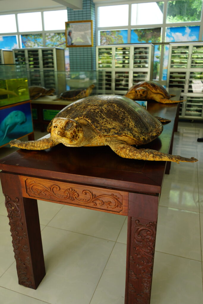 Nous sommes arrivés à l’heure de la sieste et malgré nos multiples efforts, nous n’avons pas pu réveiller le garde à l’entrée du parc…nous n’avons pas pu acheter de tickets…Entre nos différents essais de réveil du garde, nous avons visiter le petit musée et vu les tortues conservées ici. Deux espèces de tortues viennent pondre à Con Dao : la tortue verte et la tortue à écailles.