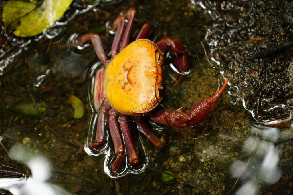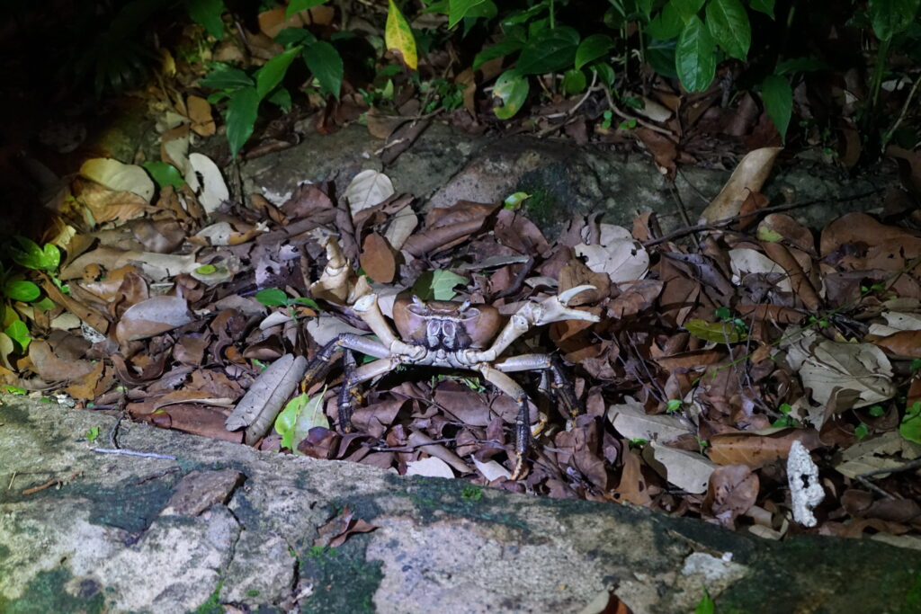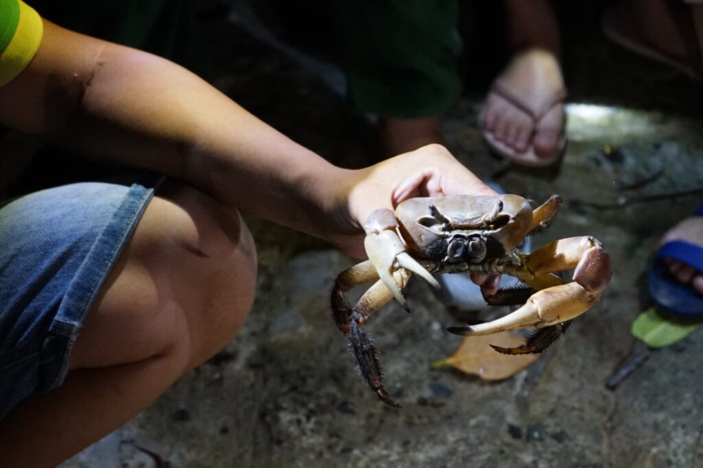 Quelle surprise de découvrir dans un trou d’eau un crabe…très loin de la mer! D’après le guide du parc de Con Dao, ces crabes vivent dans la forêt. Ils existent en de multiples couleurs et ne sortent qu’à la saison humide.