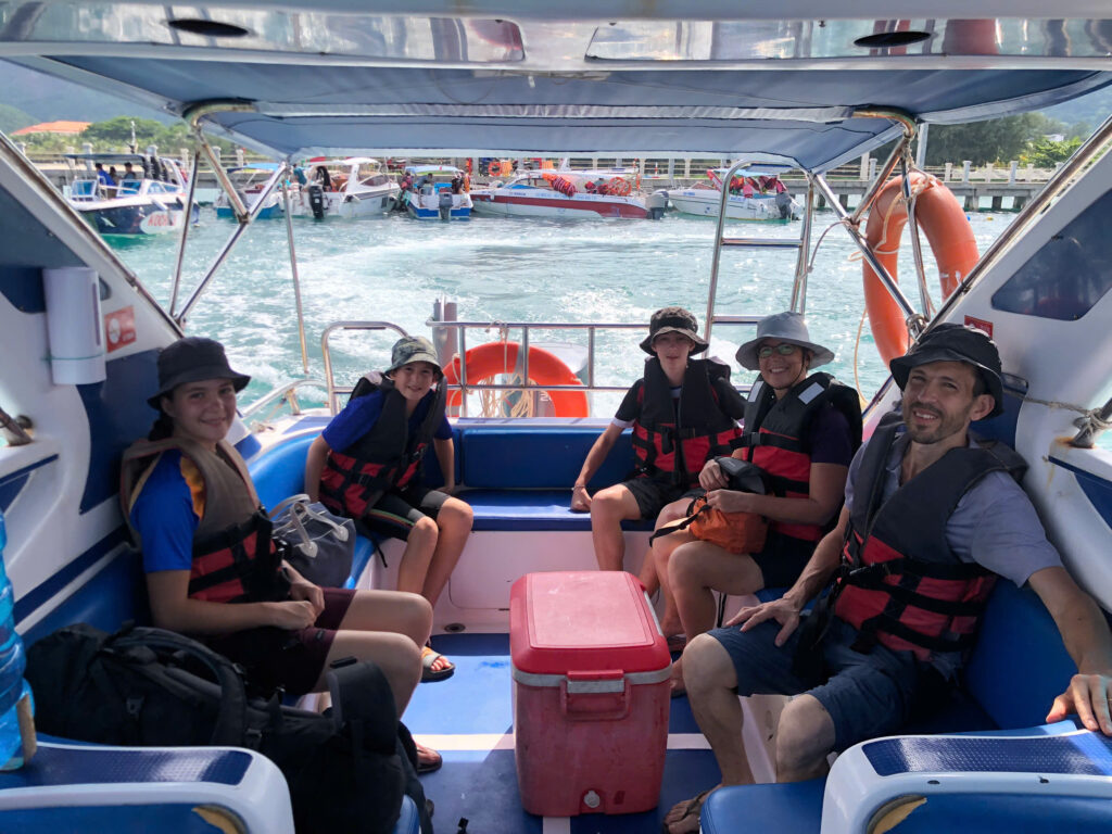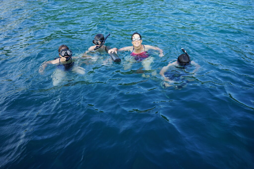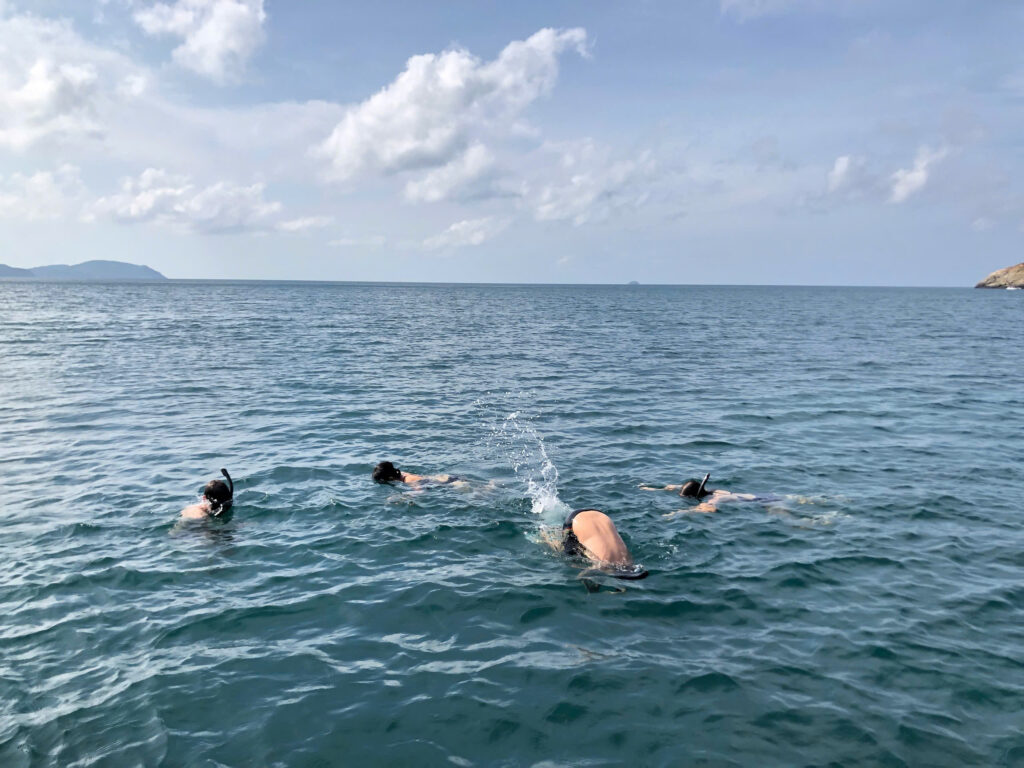 Un bateau nous a tout d’abord amené en 20 minutes sur le site de snorkelling. Il s’agit d’observer les poissons avec masque et tuba…et pour les plus à l’aise d’aller voir le fond.