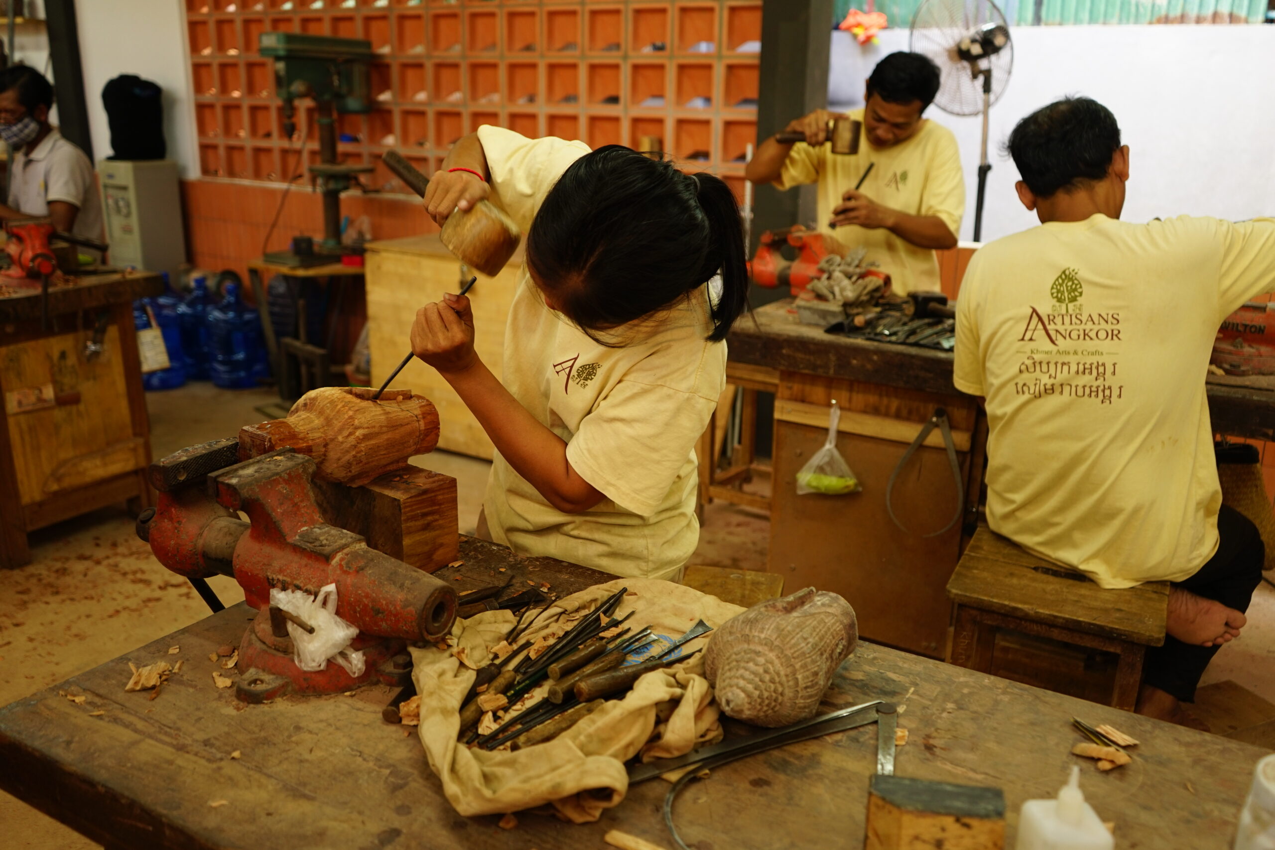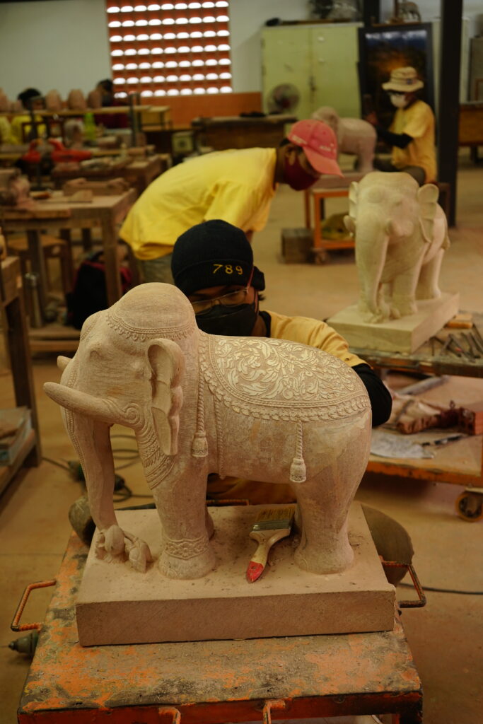 La visite d’Artisans d’Angkor (en français) nous a permis d’admirer les savoirs faire locaux. C’est est une entreprise sociale cambodgienne dont la mission est de créer des opportunités d’emplois pour les jeunes Cambodgiens défavorisés issus des milieux ruraux tout en participant à la renaissance des savoir-faire traditionnels de l’artisanat khmer.