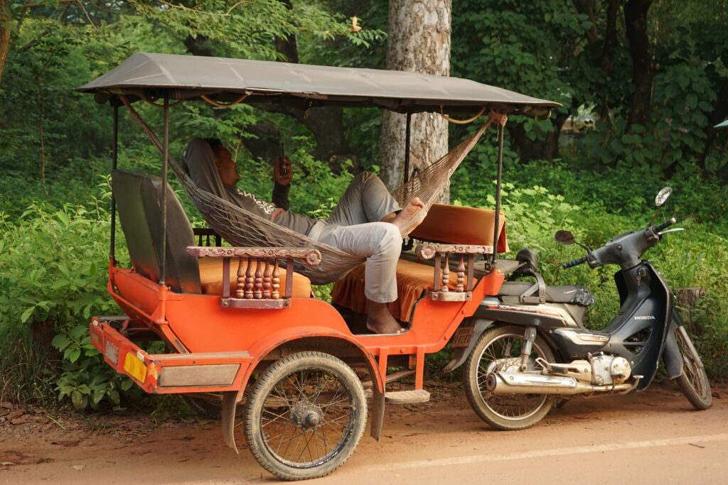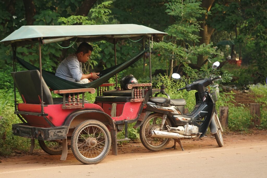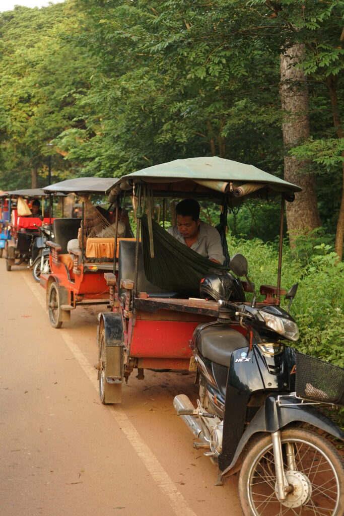 De nombreux tuks-tuks proposent leur service pour visiter les temples. Pendant les visites, leurs conducteurs se reposent :