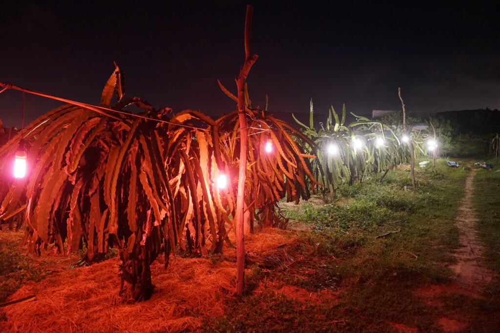 Cette région produit des fruits du dragon (Thanh long). Nous avons pu admirer les champs qui sont éclairés la nuit pour favoriser la fructification hors saison. C’est magnifique… même si écologiquement discutable!