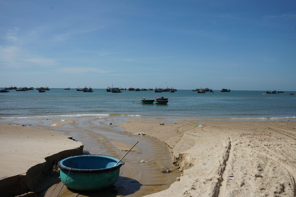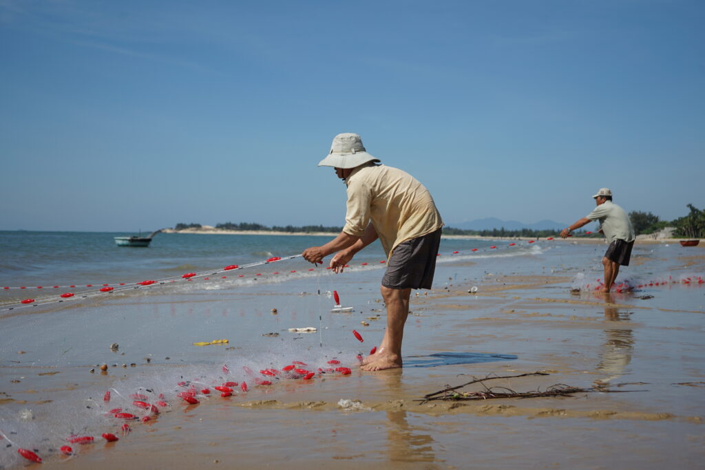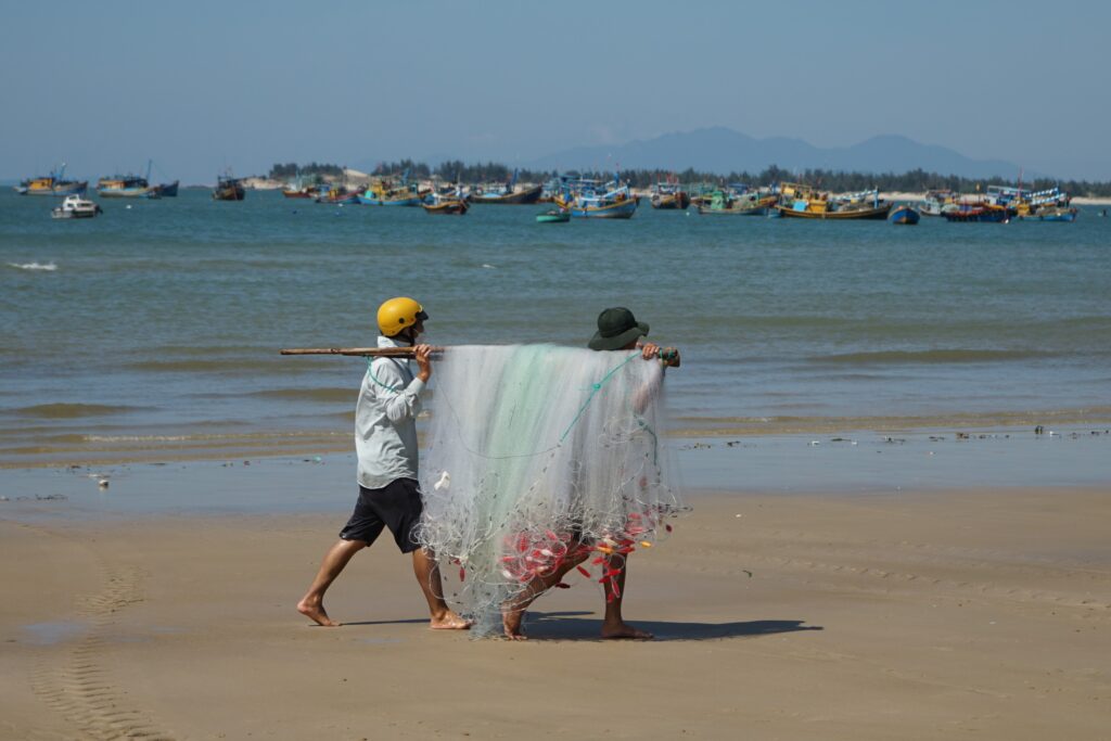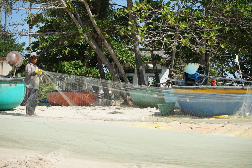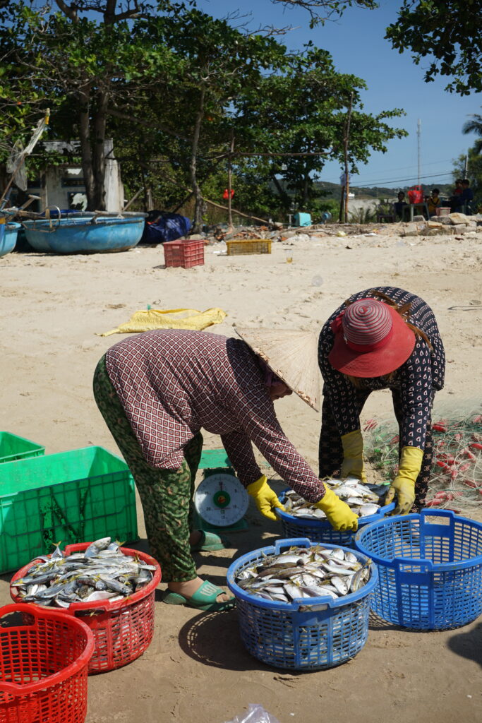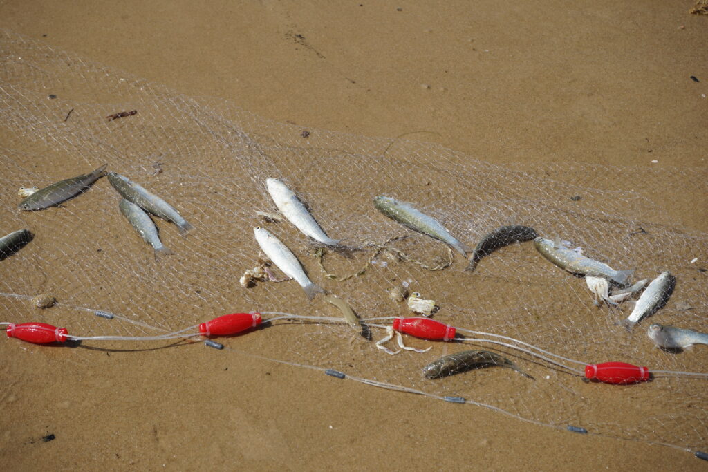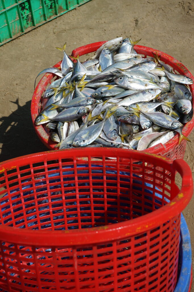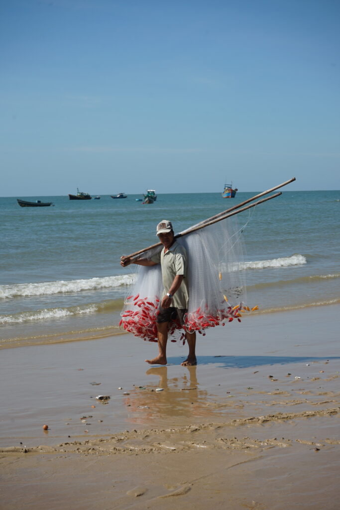 La pêche est aussi très active ici et nous avons pu voir les bateaux décharger leurs filets. Ceux ci sont ensuite triés directement sur le sable. Certains pêchent aussi du bord en déplaçant leur filet en marchant dans l’eau.