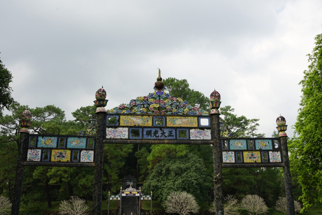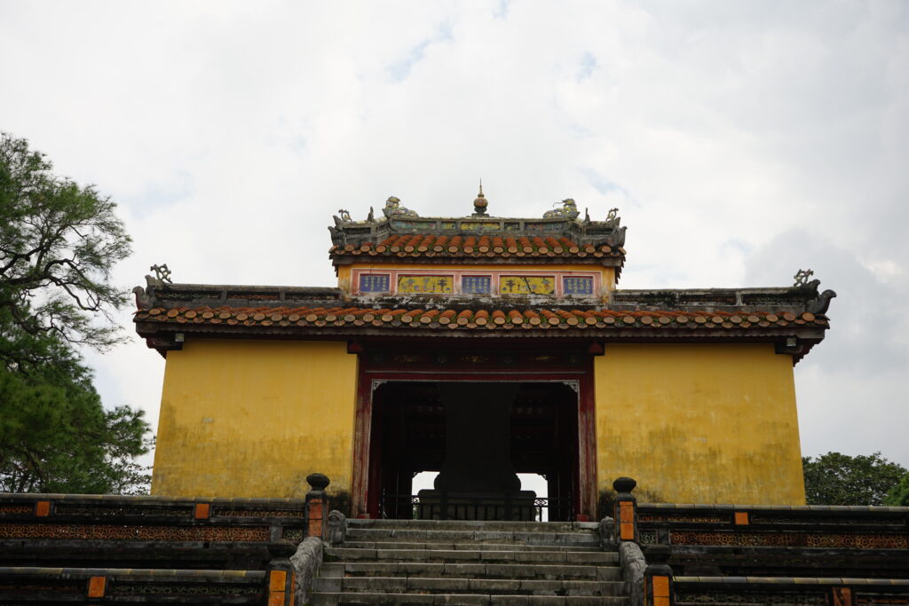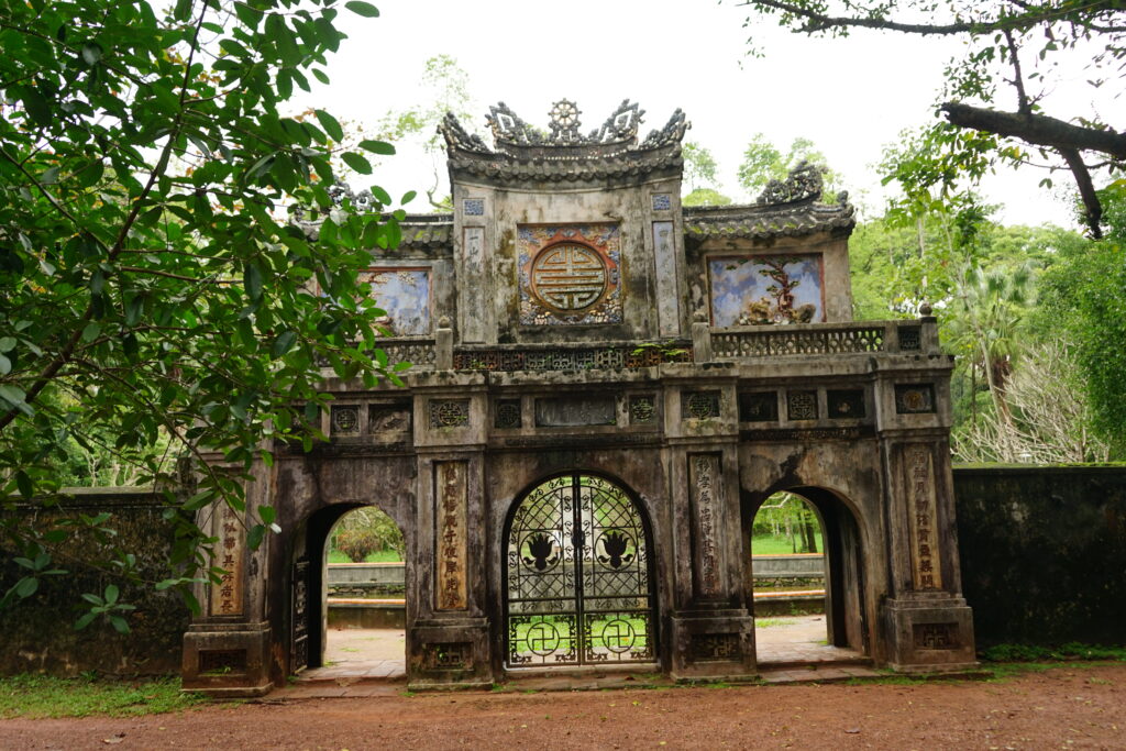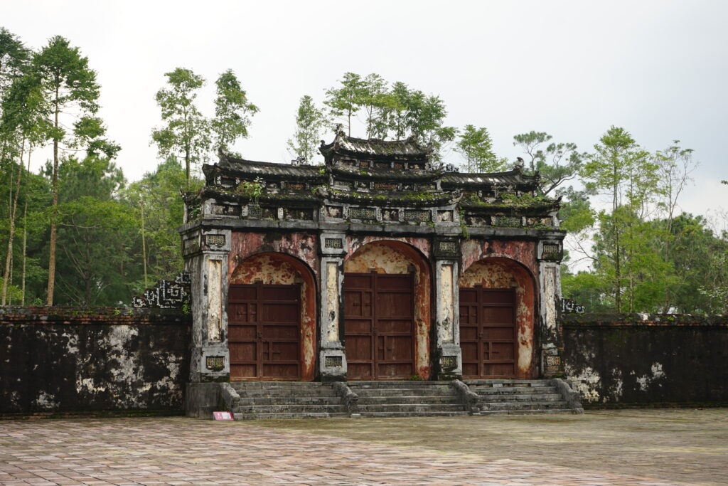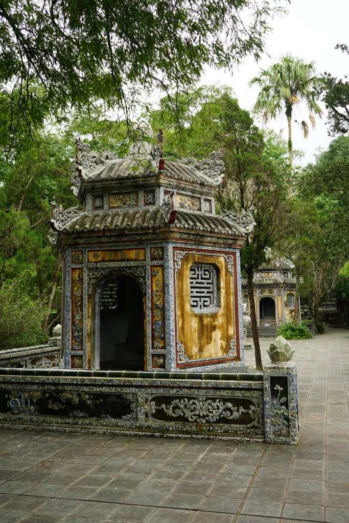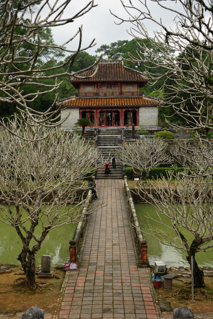 Nous avons ensuite été visiter deux des tombeaux impériaux de Huế. Les tombeaux impériaux sont non seulement le lieu de sépulture des rois de la dynastie Nguyen mais aussi leur lieu de villégiature. Ils ont été construit du vivant de ces derniers en intégrant des principes du Feng Shui. Les tombeaux ont été construits sur des collines, adossés à des montagnes pour assurer protection et harmonie. Ils sont orientés vers des plans d’eau pour favoriser la circulation d’énergie. Ils sont dirigés vers l’ouest car à leur décès, les âmes des rois rejoignent le soleil couchant pour leur repos éternel. Une grande attention est portée à la symétrie dans la construction.