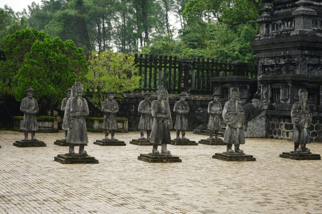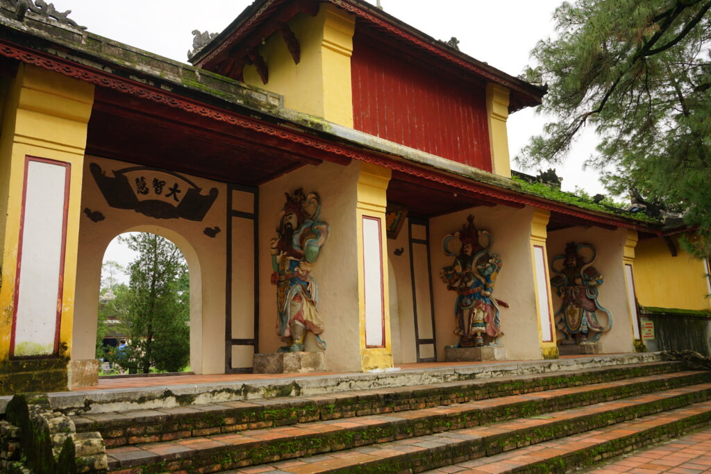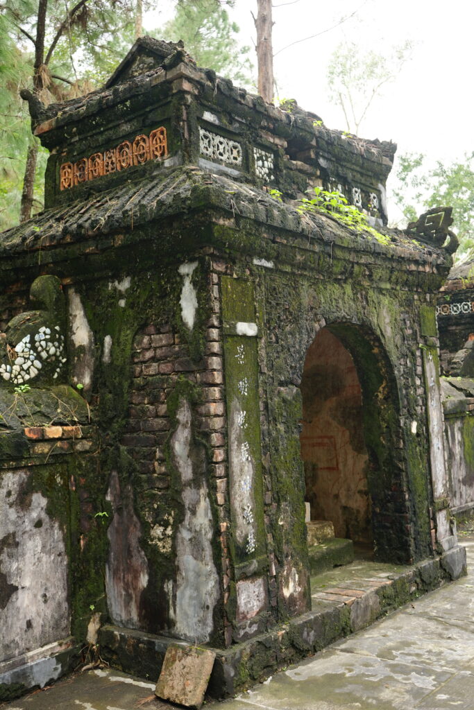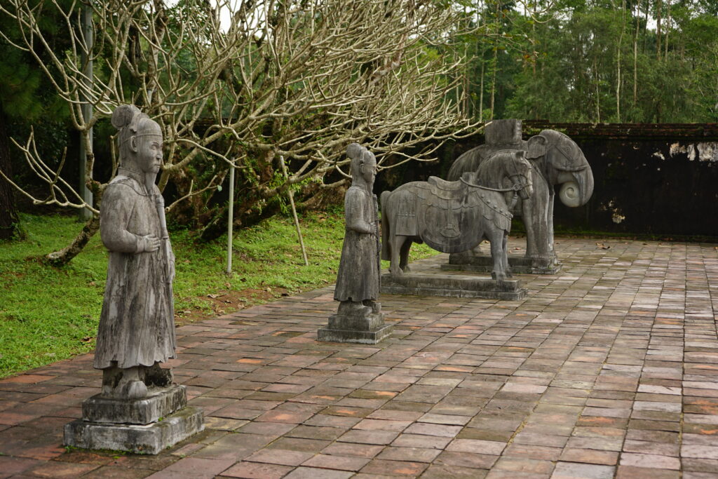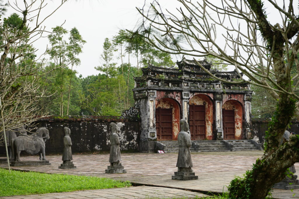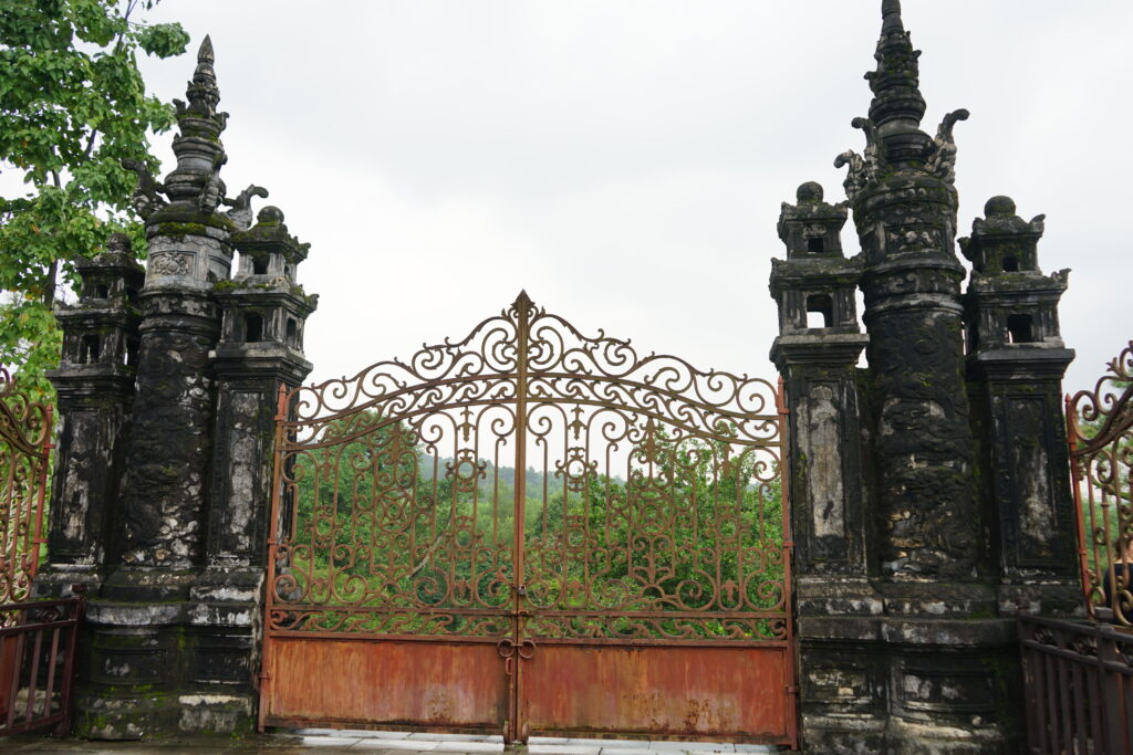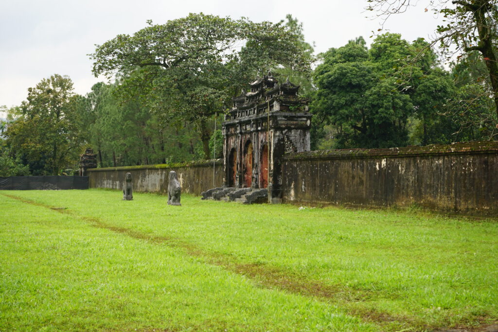 Nous avons ensuite été visiter deux des tombeaux impériaux de Huế. Les tombeaux impériaux sont non seulement le lieu de sépulture des rois de la dynastie Nguyen mais aussi leur lieu de villégiature. Ils ont été construit du vivant de ces derniers en intégrant des principes du Feng Shui. Les tombeaux ont été construits sur des collines, adossés à des montagnes pour assurer protection et harmonie. Ils sont orientés vers des plans d’eau pour favoriser la circulation d’énergie. Ils sont dirigés vers l’ouest car à leur décès, les âmes des rois rejoignent le soleil couchant pour leur repos éternel. Une grande attention est portée à la symétrie dans la construction.