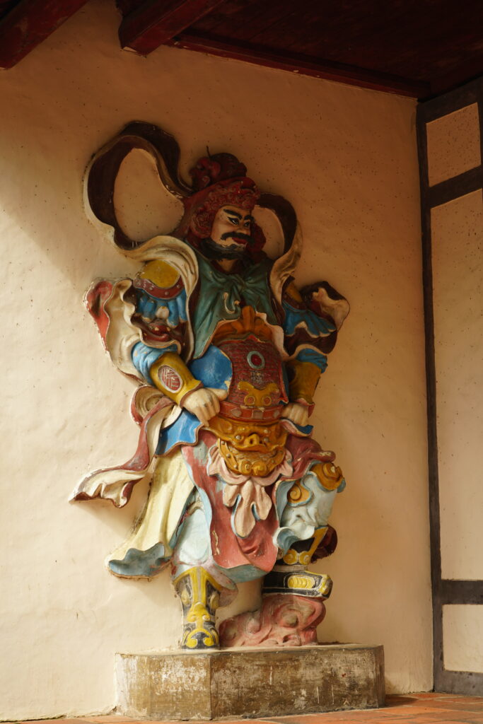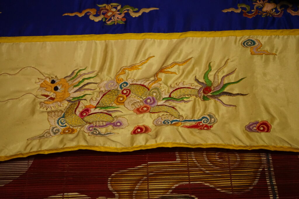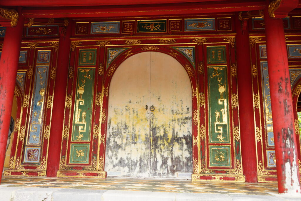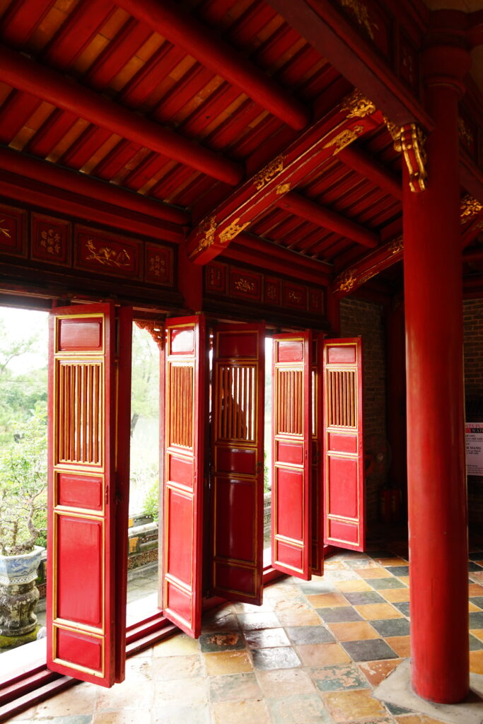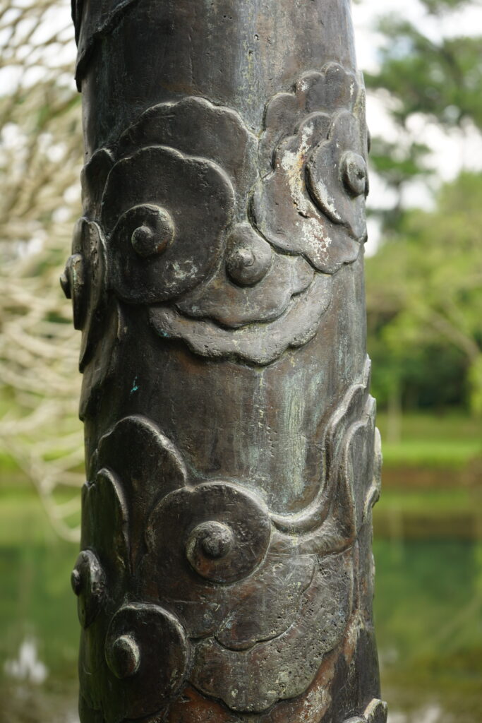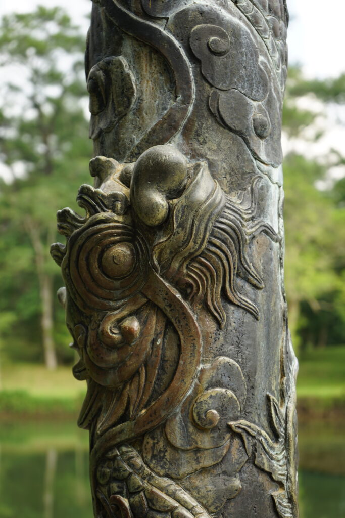 Nous avons ensuite été visiter deux des tombeaux impériaux de Huế. Les tombeaux impériaux sont non seulement le lieu de sépulture des rois de la dynastie Nguyen mais aussi leur lieu de villégiature. Ils ont été construit du vivant de ces derniers en intégrant des principes du Feng Shui. Les tombeaux ont été construits sur des collines, adossés à des montagnes pour assurer protection et harmonie. Ils sont orientés vers des plans d’eau pour favoriser la circulation d’énergie. Ils sont dirigés vers l’ouest car à leur décès, les âmes des rois rejoignent le soleil couchant pour leur repos éternel. Une grande attention est portée à la symétrie dans la construction.