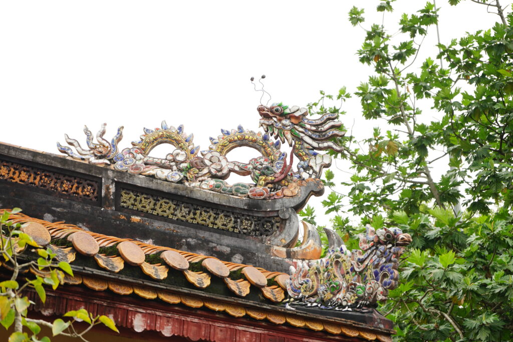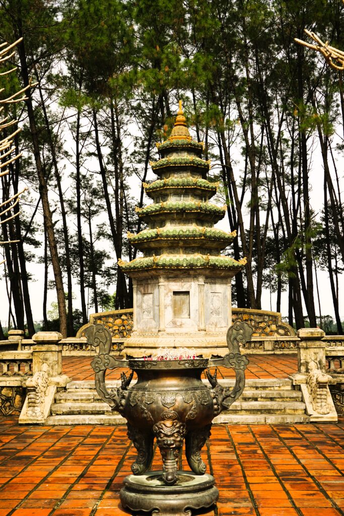La pagode de la Dame Céleste (Chùa Thiên Mụ) a été construite au 17ème siècle. Son nom fait référence a une femme qui apparaissait sur la colline et qui prédisait que celui qui bâtirait une pagode ici serait le fondateur d’une grande dynastie. La tour octogonale date seulement de 1844.