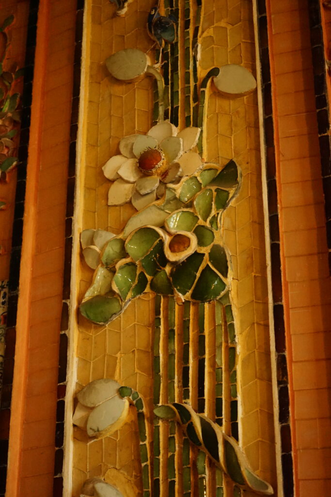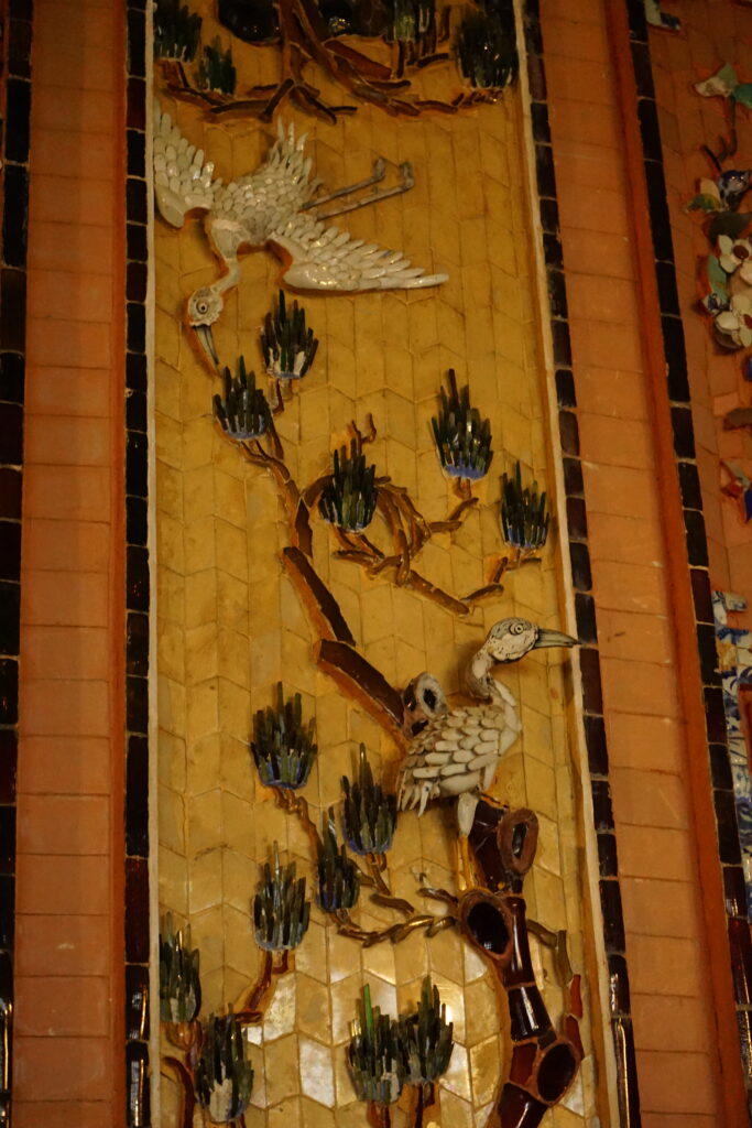 L’intérieur est décoré de mosaïques stupéfiantes en partie composée de morceaux de bouteilles. Le contraste entre la relative sobriété extérieur et le foisonnement intérieur est saisissant.