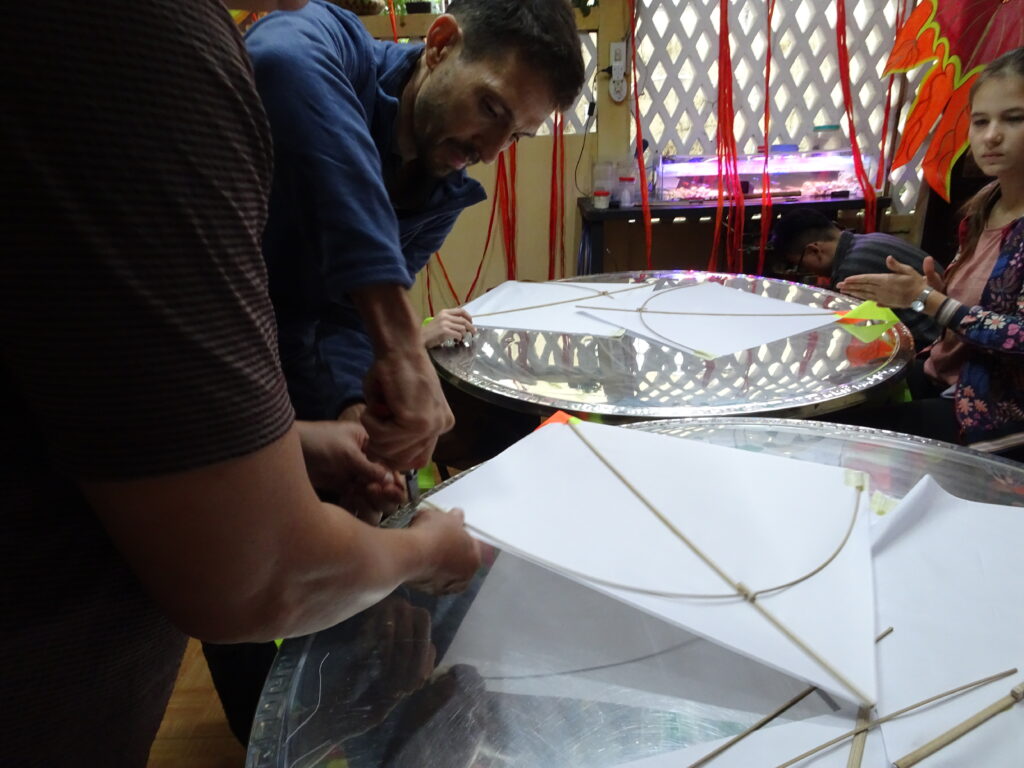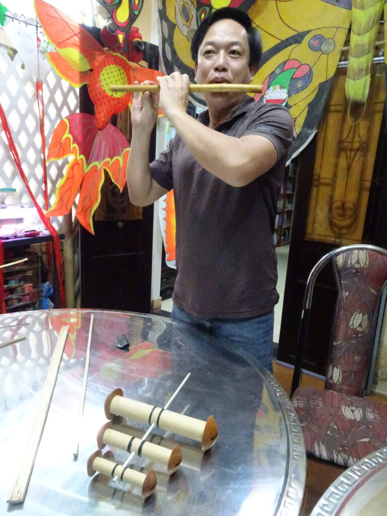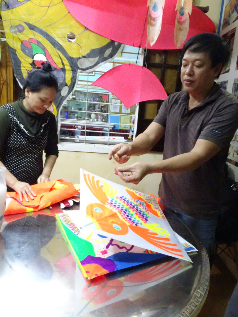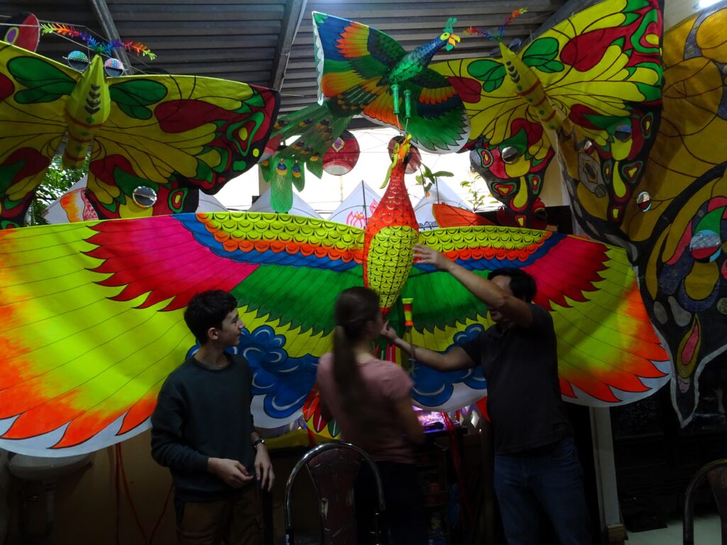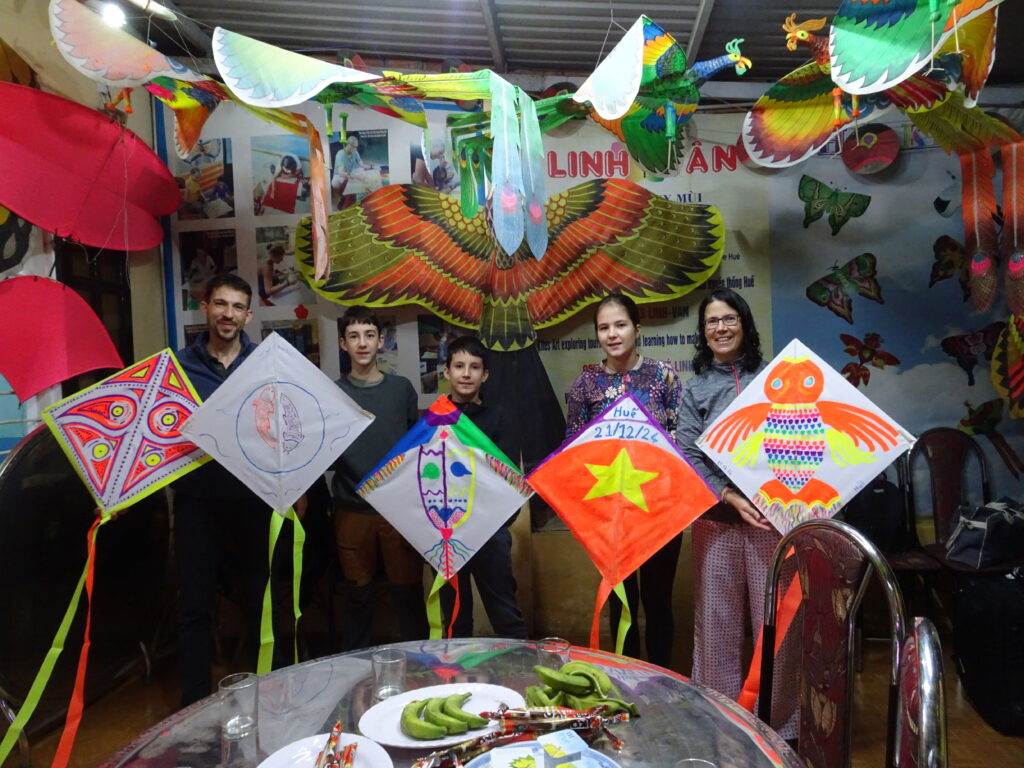 J’avais organisé un atelier cerf volant avec M. Mui dès notre arrivée à Hué. Ce fut une merveilleuse rencontre. M. Mui parle bien français et nous a accueilli comme des rois avec sa femme et un de ses fils.