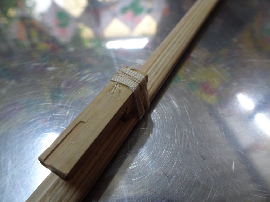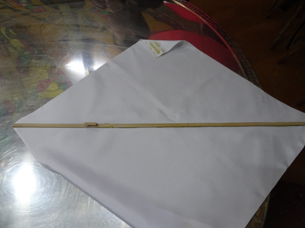 L’armature qu’il nous a fournie comporte une encoche pour que le cerf volant soit démontable. Nous avons fait une ligature pour solidifier l’assemblage collé de l’encoche. Puis nous avons collé la soie enduite avant d’attaquer l’étape de la décoration à la peinture.