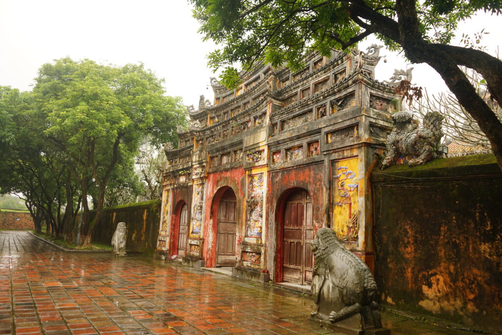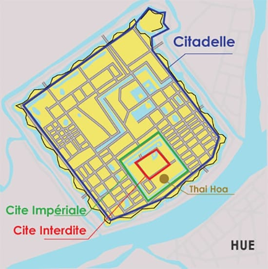 La citadelle de Hué s’étend sur une superficie de 500 ha et comprend trois remparts. Ces remparts incluent la cité impériale qui englobe elle-même la cité pourpre interdite, là où vivait le roi et ses proches.